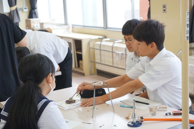2年生の理科では、金属を加熱し、加熱前と加熱後の質量の変化を実験しました。グループごとに「銅」を加熱する実験を行い、数値を表に記録しました。火を扱う実験のため、生徒たちは慎重に作業に取り組んでいました。