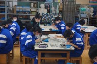 3年生の技術では、競技ロボットの製作に挑戦しています。はんだごてを用いて基板に部...