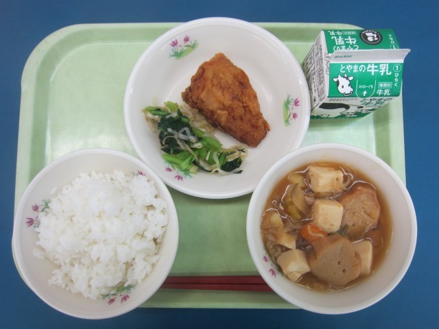 ごはん、赤魚の竜田揚げ、小松菜の浸し、すき焼き煮