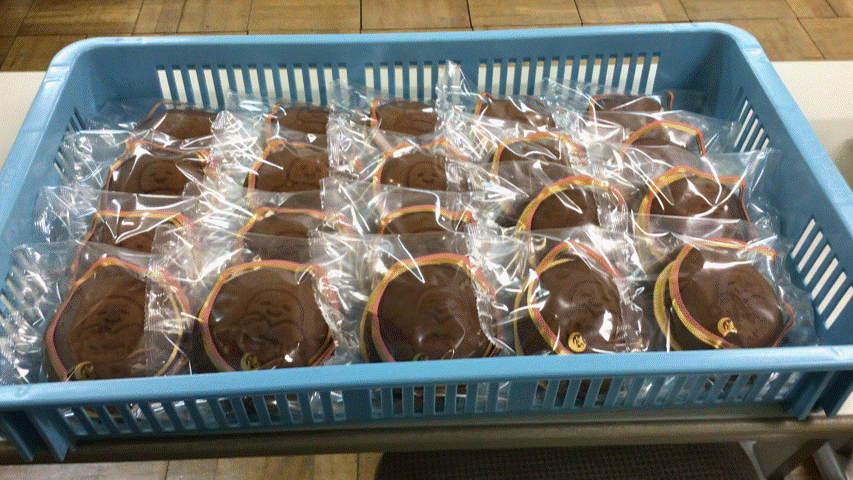 今日は当日どら焼きを販売するメンバーが中尾清月堂工場にお邪魔し、どら焼きの上に焼き印を押させていただきました。なかなか上手くいかず、苦戦する場面もありましたが、その分綺麗に押せたときは、喜びもひとしきりでした。