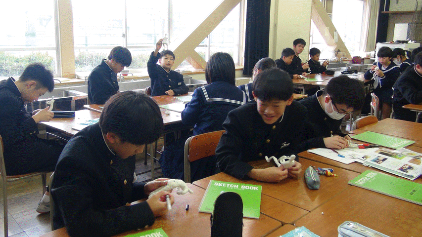 1年生美術は「ある日の教室」と題して教室での1場面を粘土で表現しています。完成すると教室になります。お楽しみに。