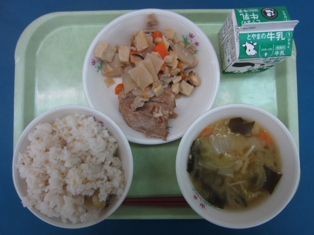 栗ごはん、さばの香味焼き、五目豆、えのきと白菜の味噌汁