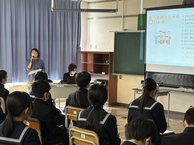 1年生を対象に「がん予防講座」を開催しました。がんを経験されたがんピアサポーターの方から、発覚した時の気持ちや家族の様子、治療の経過等についてお話を聴きました。最後に生徒たちに伝えたいこととして、「つらい時や困ったときは、周りに助けを求めること」「困っている人の声に耳を傾けること」とメッセージをいただきました。生徒たちは、がんについて考えるだけでなく、自分の命や生き方、周りの人や家族への思いやりなど、いろいろなことを感じることができたようです。貴重な講演をしていただき、ありがとうございました。