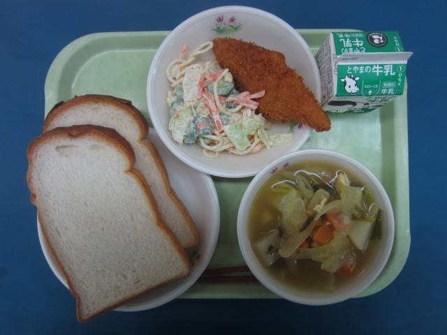 食パン、白身魚のフライ、スパゲティサラダ、カレースープ