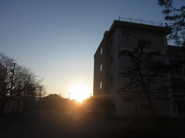 晴れ。校舎冷却のせいか、とても寒い朝です。校門前の空き地の草には霜が降りています。もう冬ですね。体調管理をしっかりして、風邪をひかないようにしてください。