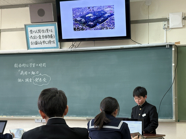 1年生では、2学期の総合的な学習の時間で学年テーマ「高岡の魅力」のもと、個人追究課題を設定し調べ学習を行ってきました。“高岡の自然”や“高岡の歴史”、“高岡の教育”などといった個人テーマを掲げ、インターネットや書籍を用いたり、現地調査をしたり、インタビューをするなどして個人調査をしてきました。そして調査内容を整理し、考察や個人の考えなどをまとめたレポート作成も行いました。12月4日(木)には、そのレポートをもとに「高岡の魅力」発表会を行いました。この日のために準備したスライドや手描きのイラストボードを見せながら、この2か月半の学習の成果を発表しました。やや緊張しながら話す様子も見られましたが、自分の調べたことを堂々と発表する姿からは、中学生になって半年余りの成長が見られました。また、調査・検索からレポート作成、スライド作成に至るまで、学習専用端末を使いこなすことも学びの一つでした。今後は、この総合的な学習の時間で得たことを発展させ、ますますの成長に繋いでいきたいと思います。