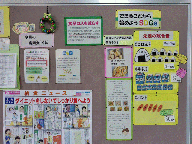 給食委員会では「食品ロス削減の呼びかけキャンペーン」と題して、身の回りのことから世界中や企業の取組について調べ放送しました。コンビニエンスストア ファミリーマートでは、おむすびやお弁当等を対象に賞味期限の近い商品には値引きや涙目シールを貼ることで消費者の購入意欲を促し食品ロスの削減を目指しています。食品ロスから見えてくる現状を伝えることで「今」自分たちができることは何かを考え、食事ができる感謝の心をもち、残さず食べようと呼びかけました。