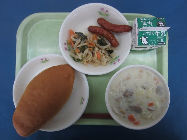 コッペパン、粗挽きウィンナー、大根サラダ、ビーンズチャウダー