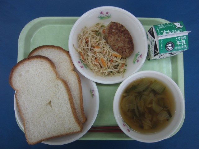 食パン、ハンバーグ、ビーフンソテー、きゃべつのスープ