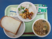 ごはん、鮭のごまマヨネーズ焼き、五目豆、味噌団子汁