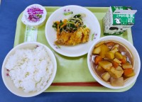 今日の献立は、ごはん、ととまる、きゃべつの生姜あえ、そうめん汁でした。今日もおいしくいただきました。