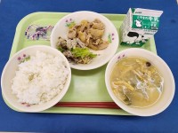 ごはん、ししゃもの石垣揚げ、青菜の生姜和え、きのこすまし汁、納豆