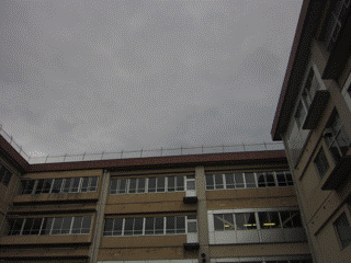 厚い雲。細かい雨が降り、風も強くなってきました。登下校は十分注意してください。