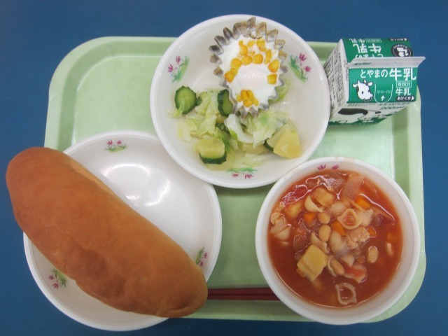 コッペパン、コーンエッグ、きゃべつとパインのサラダ、秋のミネストローネ