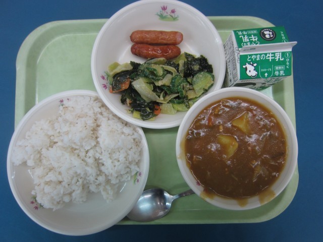 麦ごはん、和風カレー、荒挽ウィンナー、海藻サラダ