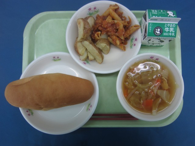 コッペパン、ペンネのミートソース、焼きポテト、きゃべつスープ