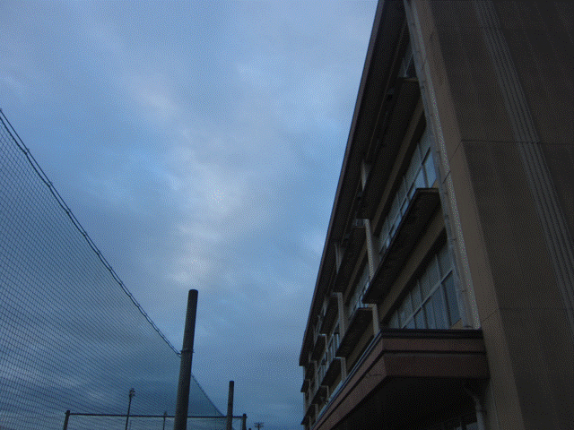 雨。雲の隙間から太陽が顔を出しています。天気予報を見ていると、今週は雪マークが出ています。十分気を付けてください。学校の敷地内の冬支度は万端。雪つりも終了しています。