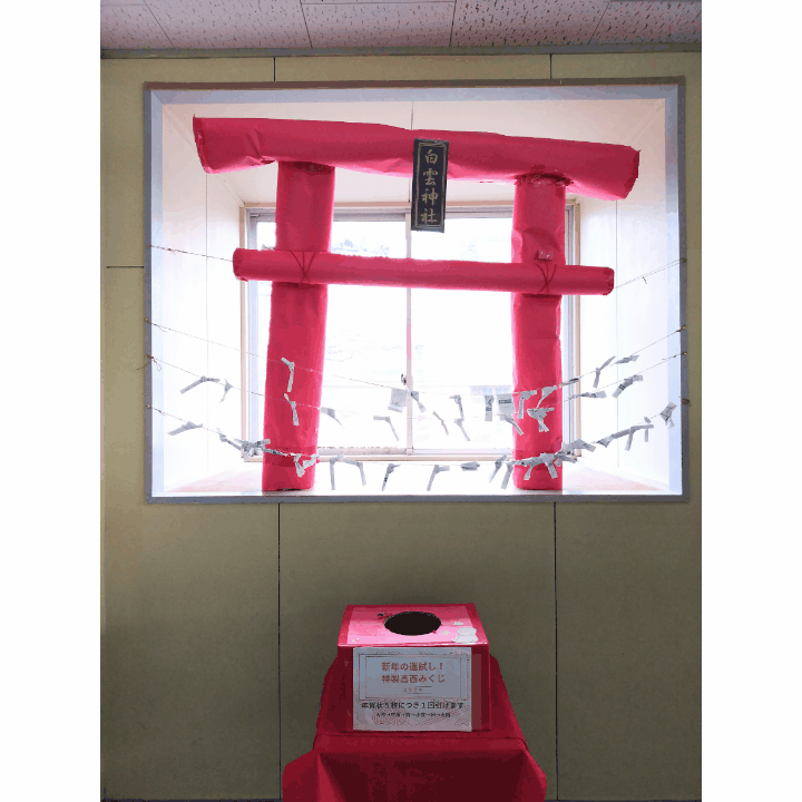 北生徒玄関に「白雲神社」が登場。生徒会の企画です。願い事をお祈りしたり、おみくじを引いたりすることができます。