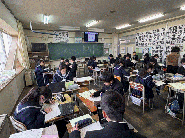 1年生では、2学期の総合的な学習の時間で学年テーマ「高岡の魅力」のもと、個人追究課題を設定し調べ学習を行ってきました。“高岡の自然”や“高岡の歴史”、“高岡の教育”などといった個人テーマを掲げ、インターネットや書籍を用いたり、現地調査をしたり、インタビューをするなどして個人調査をしてきました。そして調査内容を整理し、考察や個人の考えなどをまとめたレポート作成も行いました。12月4日(木)には、そのレポートをもとに「高岡の魅力」発表会を行いました。この日のために準備したスライドや手描きのイラストボードを見せながら、この2か月半の学習の成果を発表しました。やや緊張しながら話す様子も見られましたが、自分の調べたことを堂々と発表する姿からは、中学生になって半年余りの成長が見られました。また、調査・検索からレポート作成、スライド作成に至るまで、学習専用端末を使いこなすことも学びの一つでした。今後は、この総合的な学習の時間で得たことを発展させ、ますますの成長に繋いでいきたいと思います。