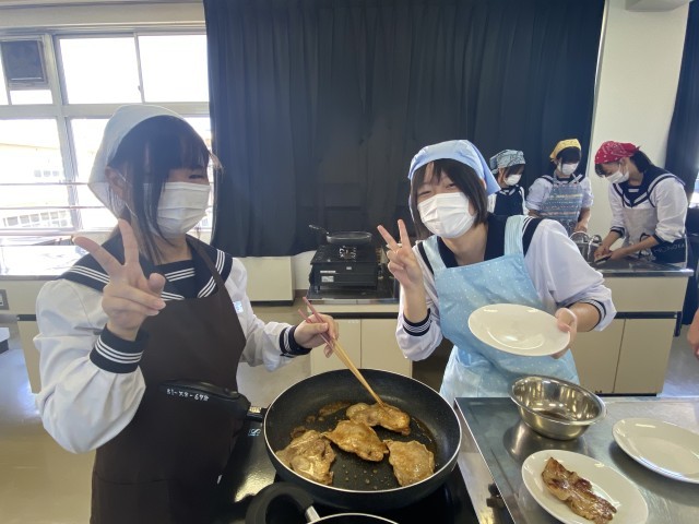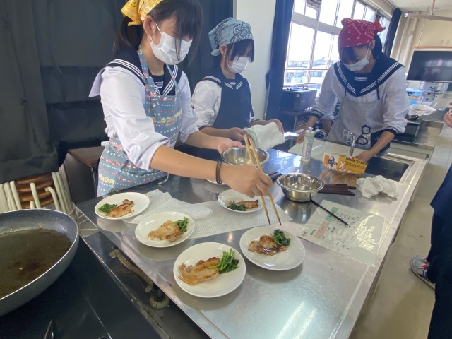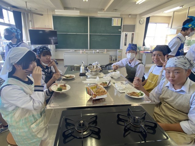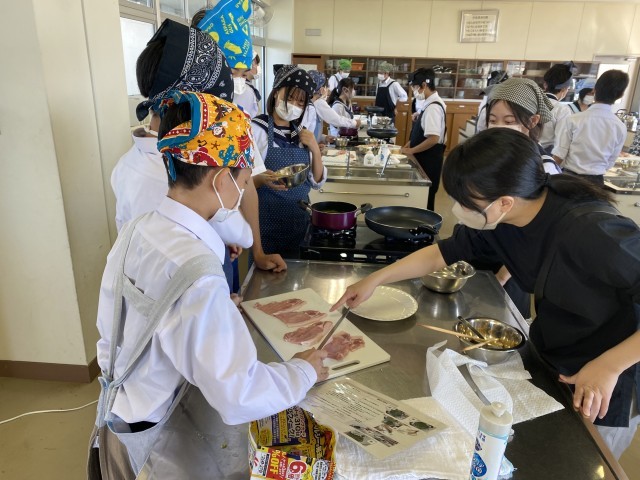 2年の家庭科では、調理実習を行っています。メニューは、ポークソテーと青菜のごまあえです。豚肉は筋切りをして柔らかく、青菜はサッとゆでて色よく。生徒たちは協力して楽しそうに実習を行っていました。どの班の料理もとても美味しそうでした。