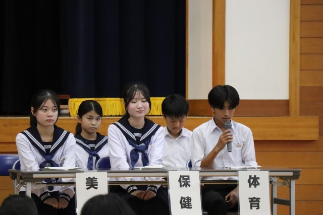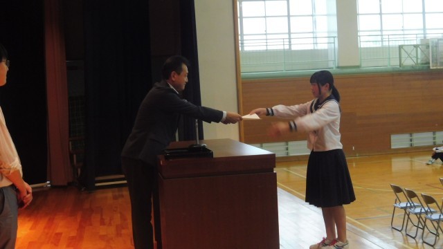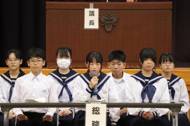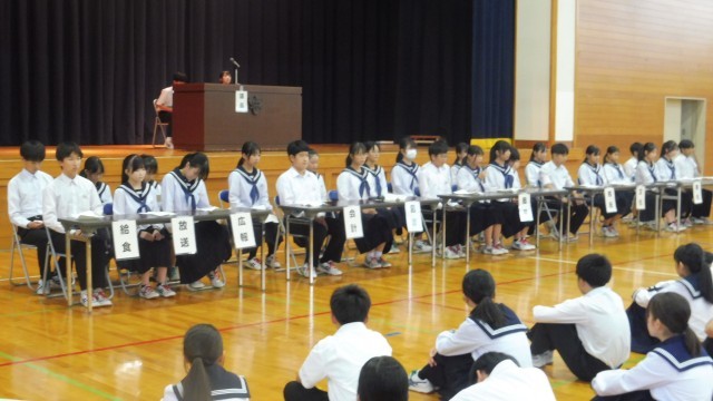 本日、生徒総会が行われました。水戸校長先生から委嘱状を手渡された松澤さんは、「結磋楽磨(けっさらくま)」をスローガンとし、全校生徒がつながりや楽しさを感じ成長できる芳野中学校を目指します、と全校生徒の前で決意を述べました。各委員長から発表された活動計画案が大勢の拍手をもって承認され、正式に後期生徒会が発足しました。