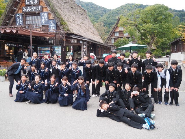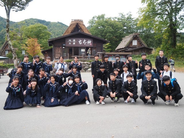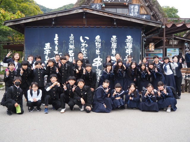 1年終日校外学習②~白川郷~ 公開日 2025/10/22 更新日 2025/10/22 第1学年 合掌造り建物前でクラス写真を撮りました。 その後、約1時間ほど班別学習を行い、再びバスで高山市へと向かいます。