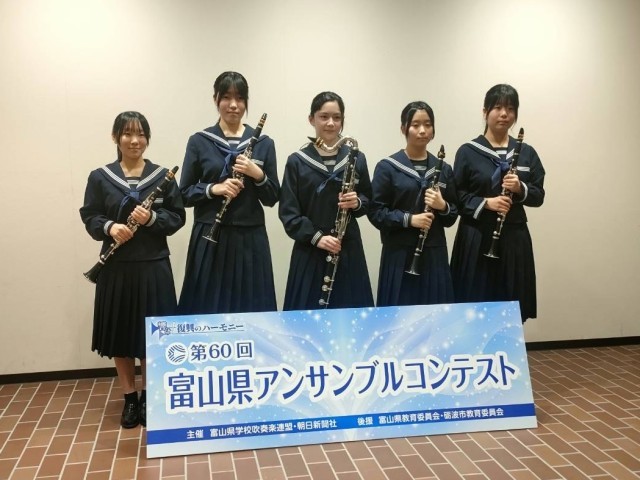 富山県アンサンブルコンテスト 公開日 2026/01/25 更新日 2026/01/25 部活動 本日、砺波市文化会館にて第60回富山県アンサンブルコンテストが開催されました。本校からは、サックス、金管、クラリネットの3チームが出場し、全チームが金賞を獲得しました。惜しくも次の大会へ進むことは叶いませんでしたが、どのチームの演奏も、一音一音に気持ちがこもった素晴らしいものでした。