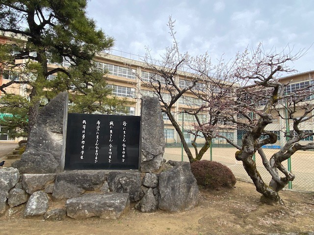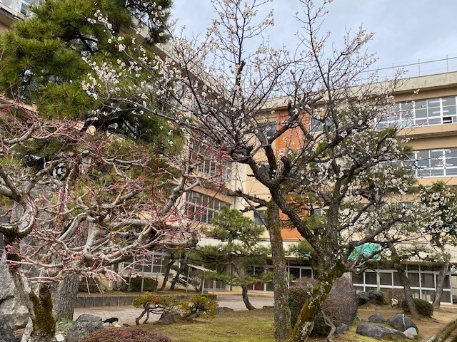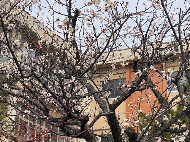 校庭の白梅が花を咲かせました。その後を追いかけるように、今度は紅梅が咲き始めます。