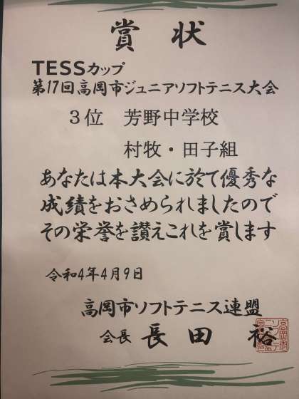 TESSカップ 高岡市ジュニアソフトテニス大会 公開日 2022/04/11 更新日 2022/04/11 部活動 4月9日、標記大会が行われ、男子は蟹瀬、角崎組が3位 女子は村牧、田子組が3位に入りました。 おめでとうございます。