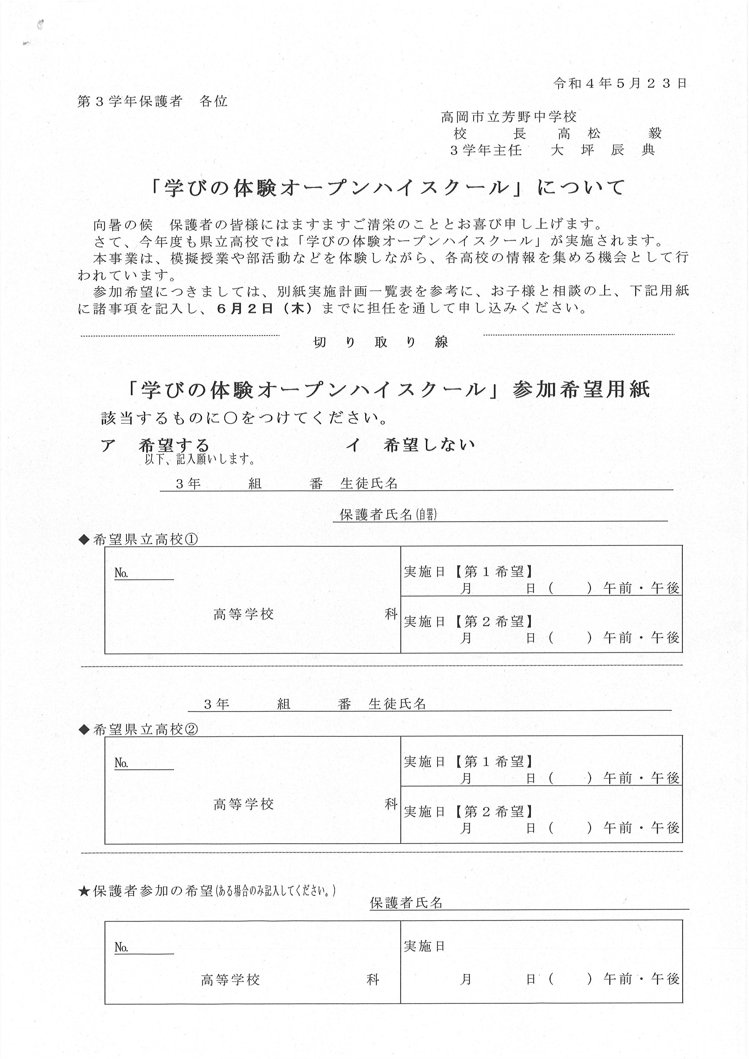夏休み頃より始まるオープンハイスクールに向けて、資料を参考にじっくりと話を聞いていました。県立高校の参加希望者は学級担任に6月2日(木)までに提出する書類があります。保護者と相談の上、提出することになっています。よろしくお願い致します。