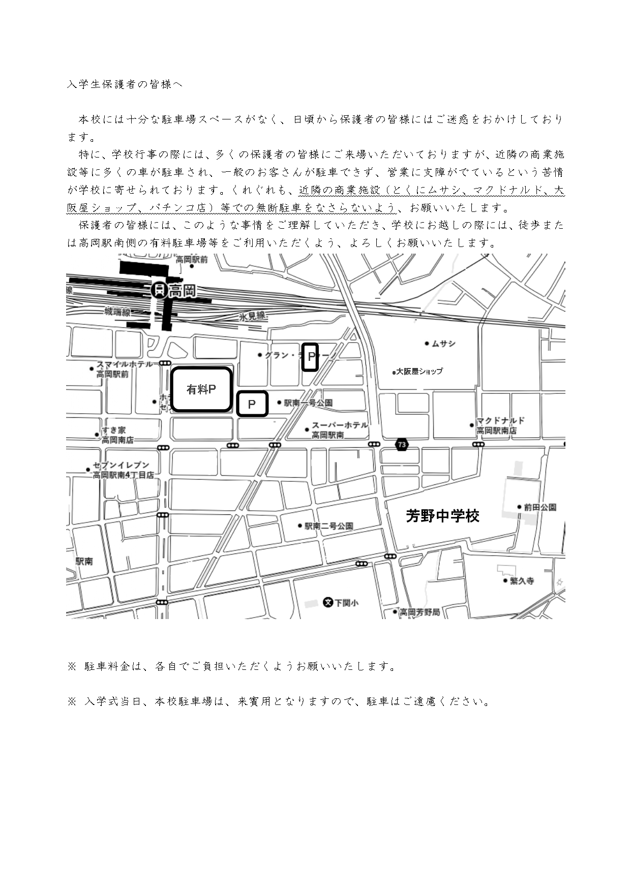 尚、中学校に保護者用の駐車場は準備できませんので、駐車場についての案内をご覧ください。また、近隣の商業施設等への駐車はお止めください。ご理解とご協力をお願いいたします。芳野中学校周辺の駐車場