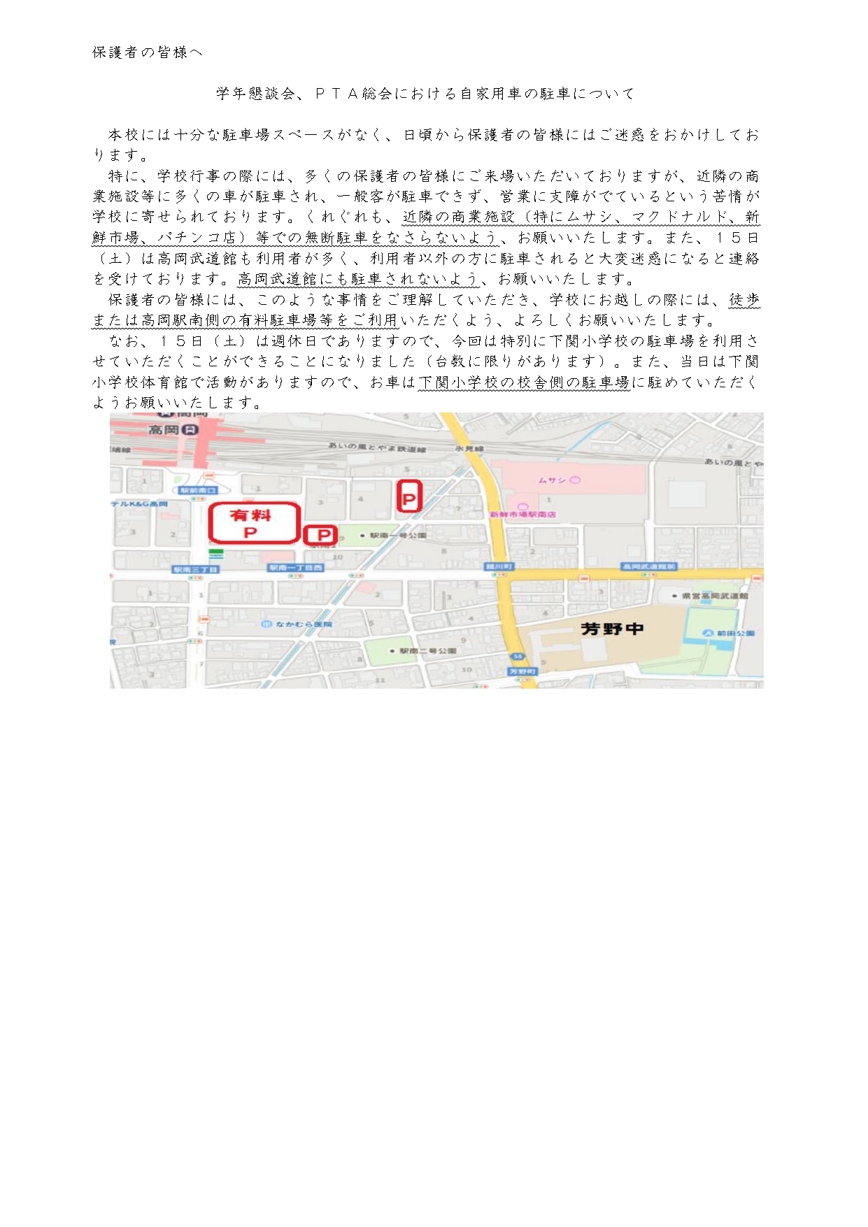 尚、中学校に保護者用の駐車場は準備できませんので、駐車場についての案内をご覧ください。また、近隣の商業施設等への駐車はお止めください。ご理解とご協力をお願いいたします。PTA総会駐車案内