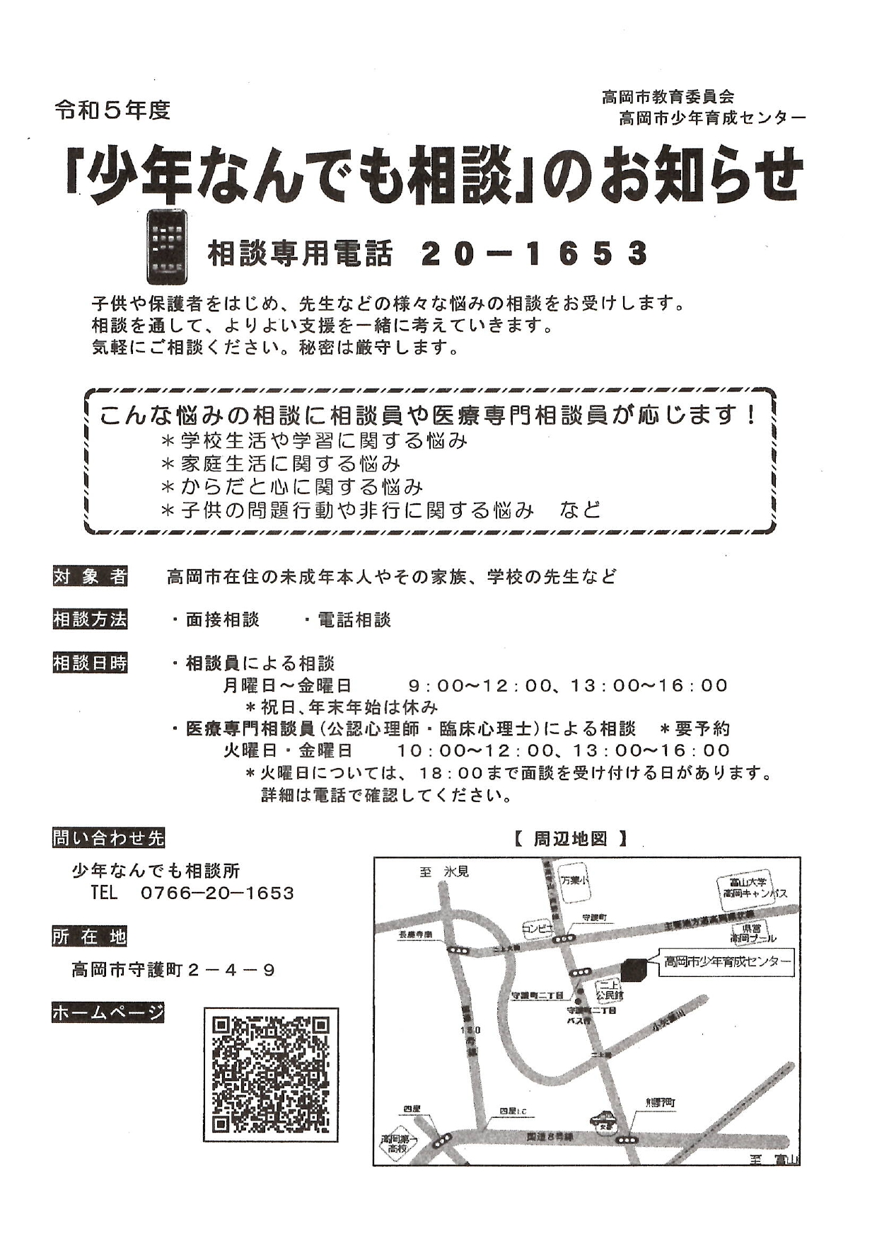 高岡市教育センターより令和5年度 青少年相談窓口の案内と「少年なんでも相談」のお知らせが届きました。本日1年生に青少年相談窓口の案内を配付しました。ご確認ください。くわしくはこちら↓
