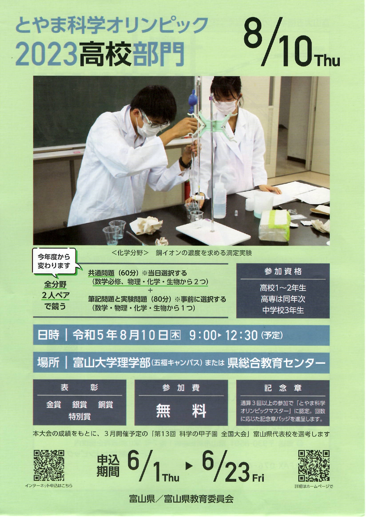 とやま科学オリンピック2023のお知らせ 公開日 2023/06/06 更新日 2023/06/06 お知らせ 富山県教育委員会から「とやま科学オリンピック」の要項が届きました。中学部門は全員参加可能で、高校部門は3年生が参加できます。詳しくは配布される要項をご覧下さい。とやま科学オリンピック中学部門 とやま科学オリンピック高校部門
