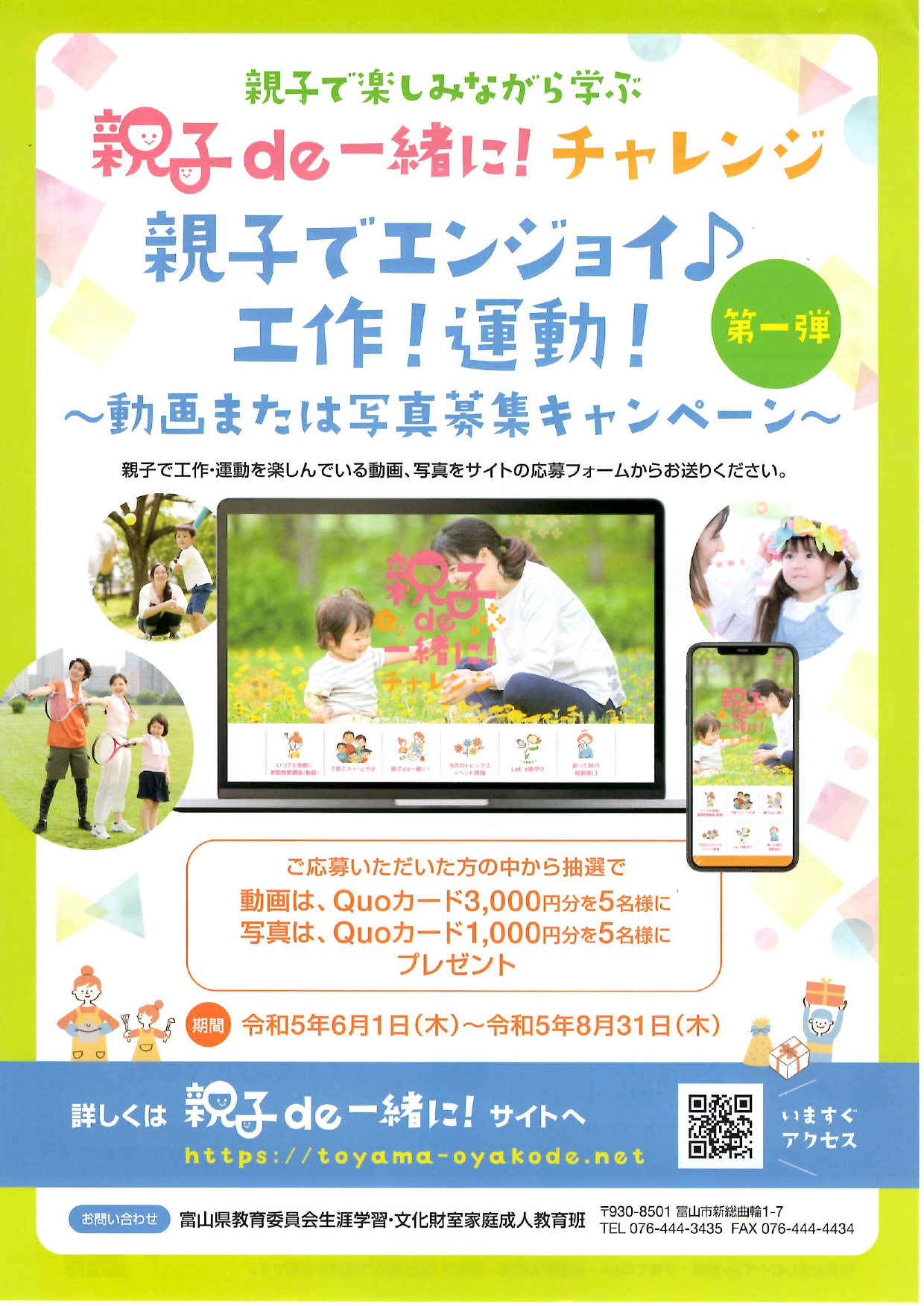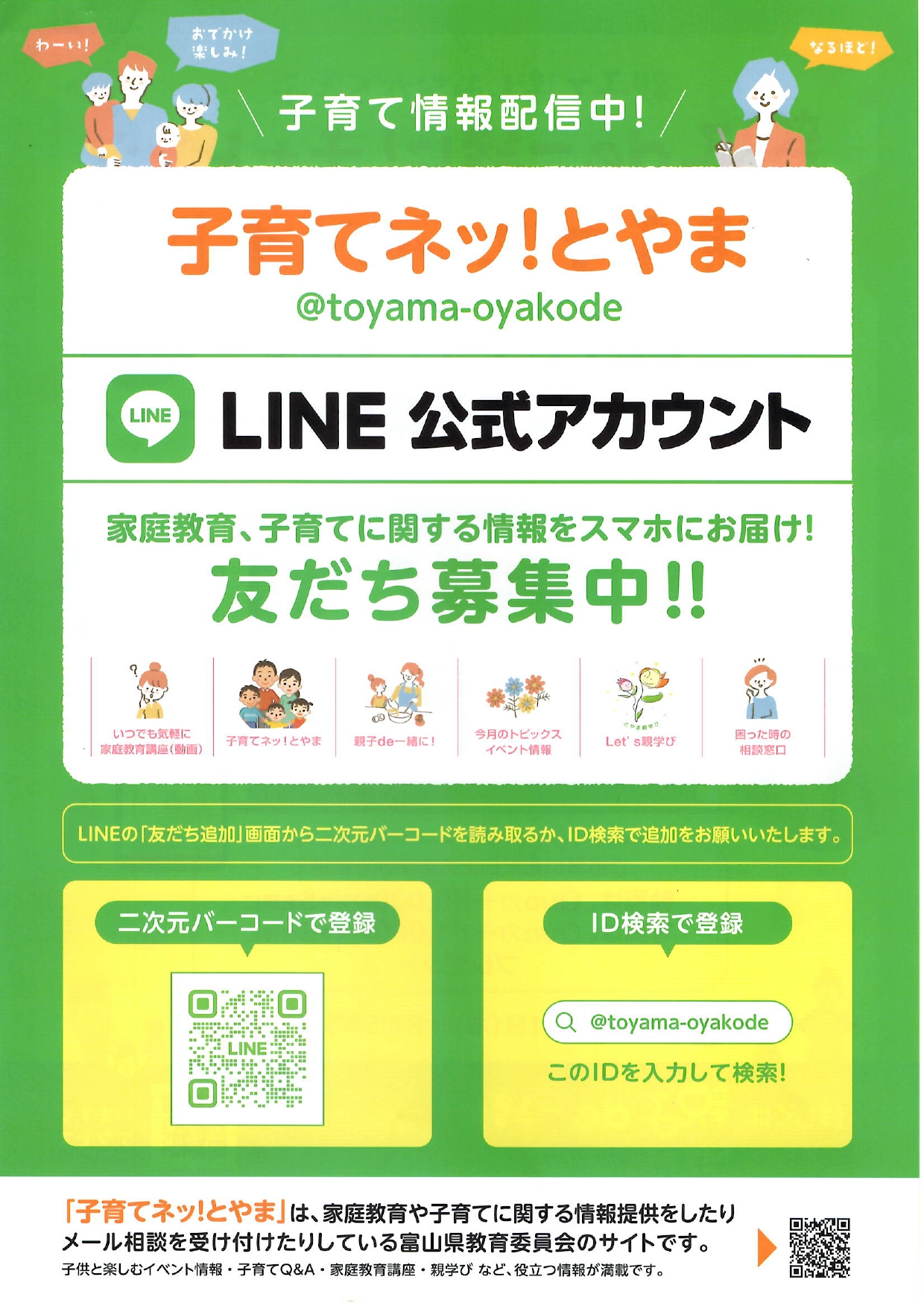「子育てネッ!とやま」案内 公開日 2023/06/06 更新日 2023/06/06 お知らせ 富山県教育委員会より、子育てに関する情報提供をしたりメール相談を受け付けたりしているサイトの案内がありました。 詳しくはこちら↓ 子育てネッ!とやま 親子でエンジョイ♪工作!運動!