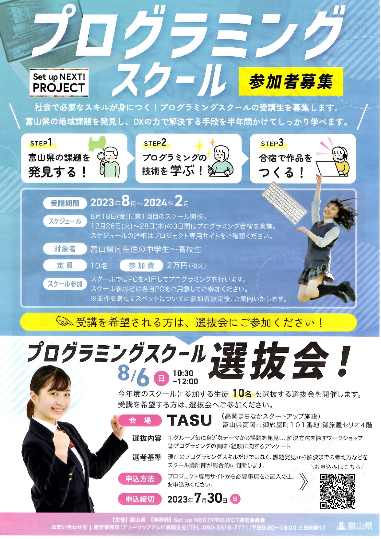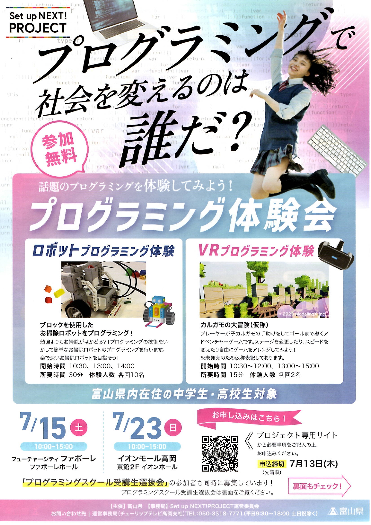 プログラミング体験会のご案内 公開日 2023/07/03 更新日 2023/07/03 お知らせ 富山県主催の「プログラミング体験会」のお知らせが届きました。参加をご希望される方は、直接応募してください。締め切りは7月13日です。 くわしくはこちら ↓ プログラミング体験会案内 プログラミングスクール案内