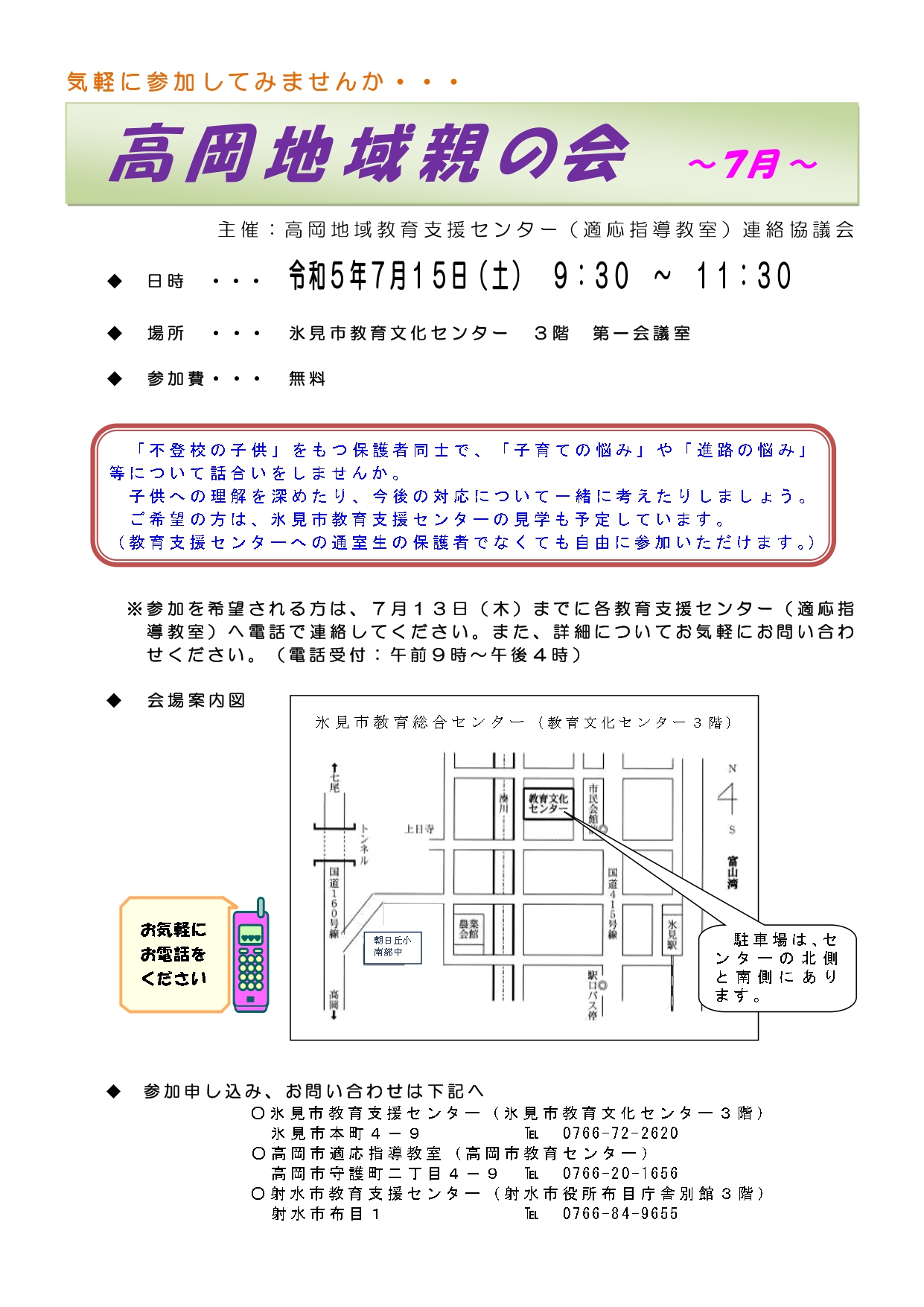 高岡地域教育支援センター連絡協議会より、7月の「高岡地域親の会」のお知らせが届きました。