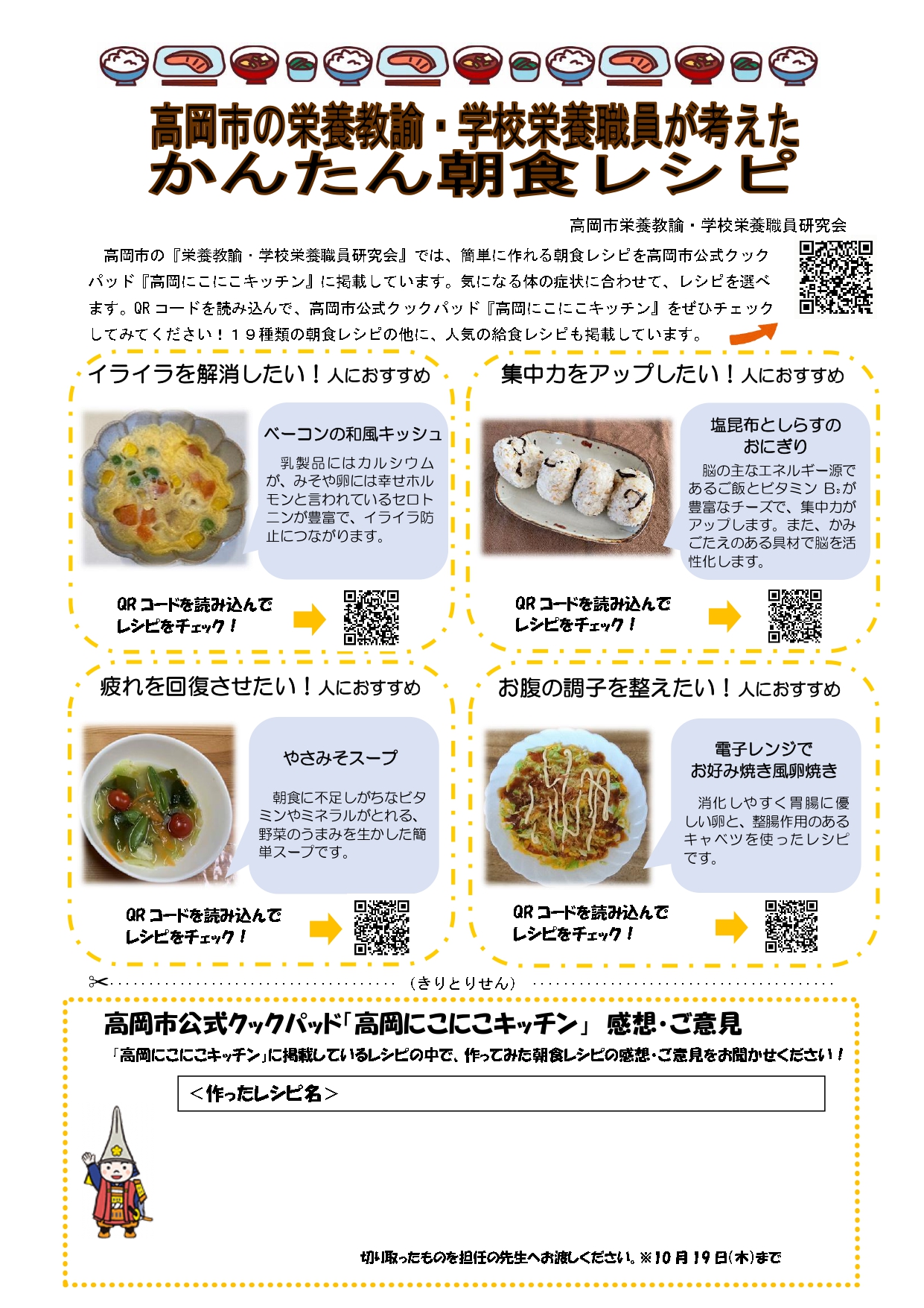 本日、高岡市栄養教諭・学校栄養職員研究会で作成された「かんたん朝食レシピ」の紹介だよりを配付しました。QRコードを読み込むと、「集中力をアップしたい」「疲れを回復させたい」など、気になる体の症状に合わせてレシピを選べるようになっています。ぜひご活用ください。また、保護者の皆様のご意見・ご感想を寄せて頂ければありがたいです。よろしくお願いいたします。