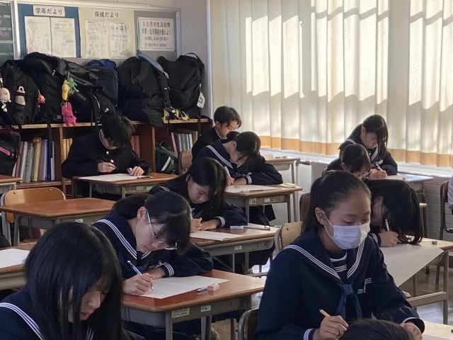お知らせ 本日より2学期の中間テストが始まりました。本校では、定期テストの際に特別な時間割をつくり、生徒や教員が時間と心に余裕をもってテストに臨めるようにしています。中間テストは明日まで続きます。落ち着いて問題に取り組みましょう。 1限 8:45~ 9:35 2限 9:50~10:40 3限 10:55~11:45 4限 12:00~12:30 給食 12:30~13:05 清掃 13:15~13:30 帰会 13:30~13:40 完全下校 14:00