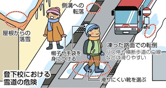 朝は、路面の凍結、通学路や車道が狭くなる、屋根からの落雪など、登下校の危険が予想されますので、安全に登校できるよう、ご家庭でもご指導をお願いします。