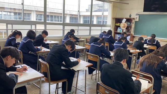1,2年生は期末考査5教科、3年生は実力テストが行われています。これまでの学習の総まとめです。集中して最後まで取り組んでほしいと思います。
