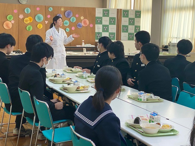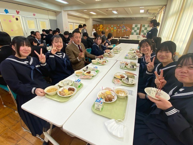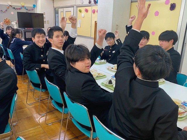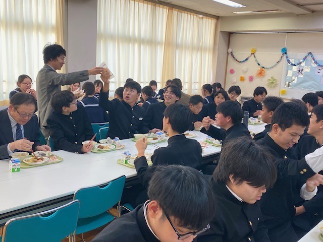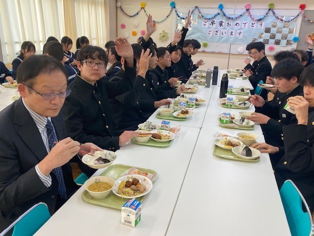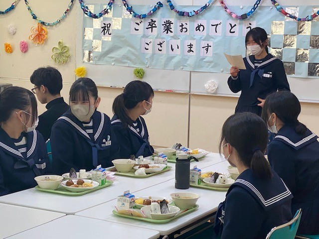 卒業を控えた3年生が、先生方と一緒に給食を囲む「卒業ランチ」。今日は3年1組で実施されました。栄養士さんにも準備などを手伝っていただき、和やかな雰囲気の中で楽しい時間を過ごせたようです。毎日当たり前のように食べてきた給食も、あと少し。一食一食を大切に、感謝の気持ちで味わいたいですね。