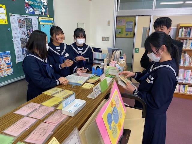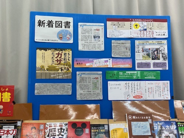 図書室には、新着図書の紹介をはじめ、工夫を凝らした掲示物や企画がたくさん揃っています。普段あまり本を読まない人も、図書室で本の魅力を発見できるかもしれません。進んで図書室を利用してほしいと思います。