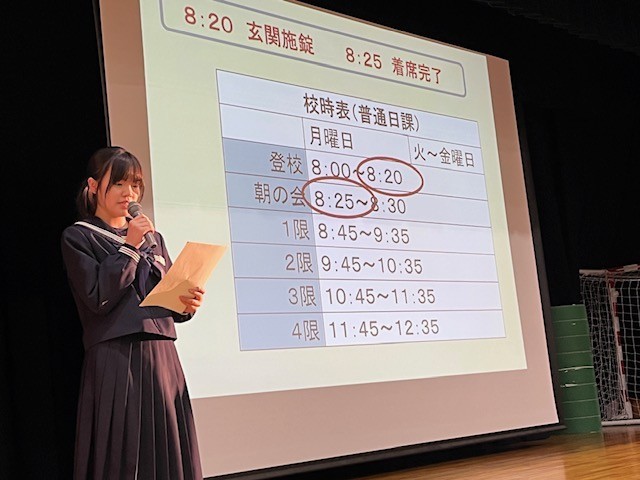 全校生徒が、安心安全に学校生活を送れるように、そして主体的に諸活動に取り組むことを目指して生徒会では一昨年前から生活のきまりについて見直しています。これまで、靴下の色や髪型について検討し、見直しを図ってきました。先日「校内での防寒着着用」について検討委員会をもち、生徒会総務、各学級代表1名、学年担当の先生が出席し、意見を交換しました。その内容を生徒会総務が校長に報告しました。検討した結果を月曜日に全校生徒に放送で伝えます。