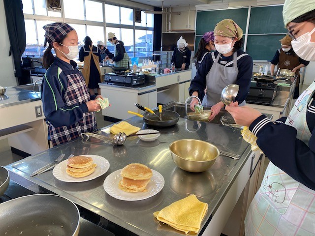 本日、家庭部はお菓子作り(ホットケーキ)を行っていました。調理室に入ると厚みのあるふわふわのホットケーキが出来上がっていました。クリームとチョコレートでデコレーションされ、職員室の先生方にもふるまわれました。とても美味しかったです。ご馳走様でした。
