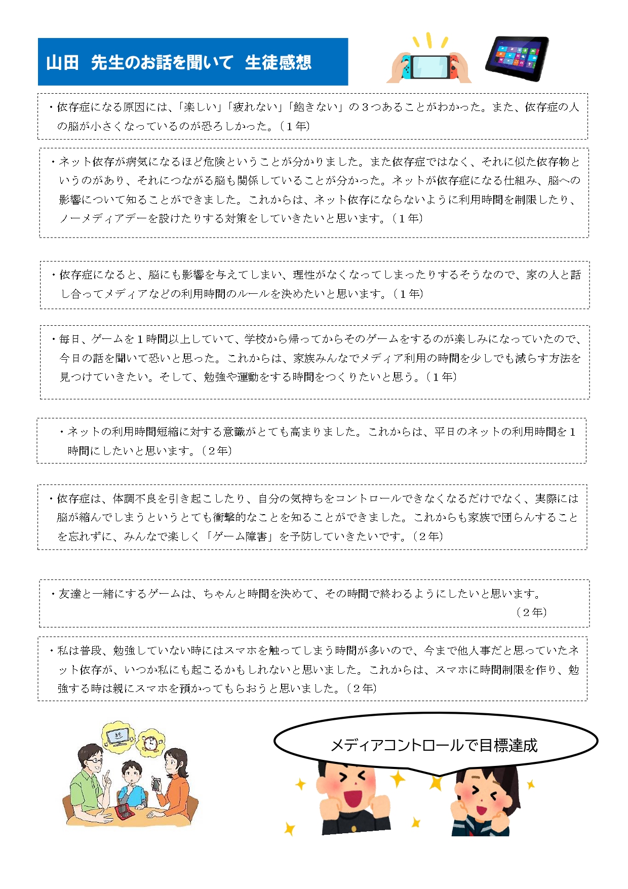 先日行われたネット依存をテ-マにした学校保健委員会の内容をまとめた内容を、「学校保健委員会だより」にまとめました。メディアコントロールに向けてご家族で話し合い、ルールを決めて生活習慣の改善を図って欲しいと思います。