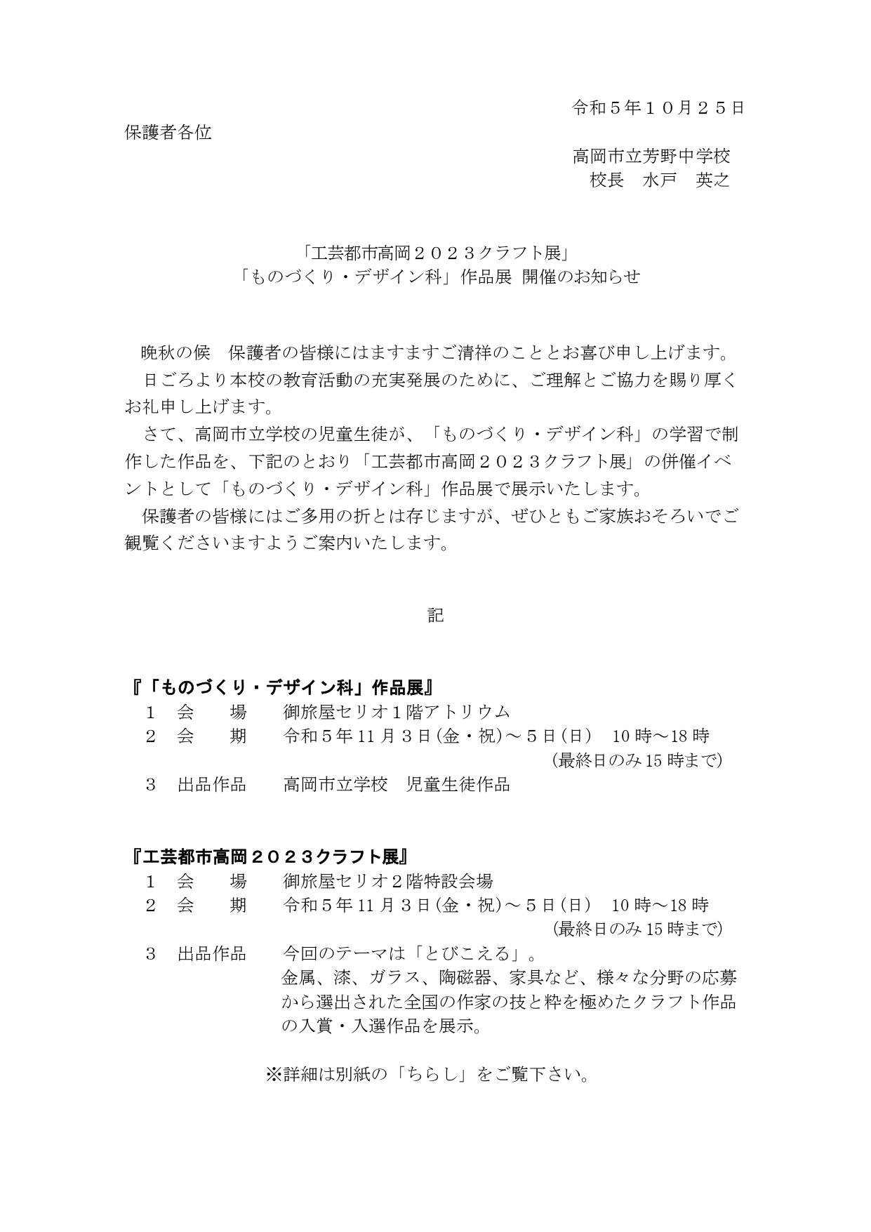 高岡市内の小中学生が、「ものづくり・デザイン科」の学習で制作した作品を、「工芸都市高岡2023クラフト展」の併催イベントとして展示いたします。保護者の皆様には、ご多用の折と存じますが、ぜひともご家族おそろいでご観覧くださいますようご案内いたします。