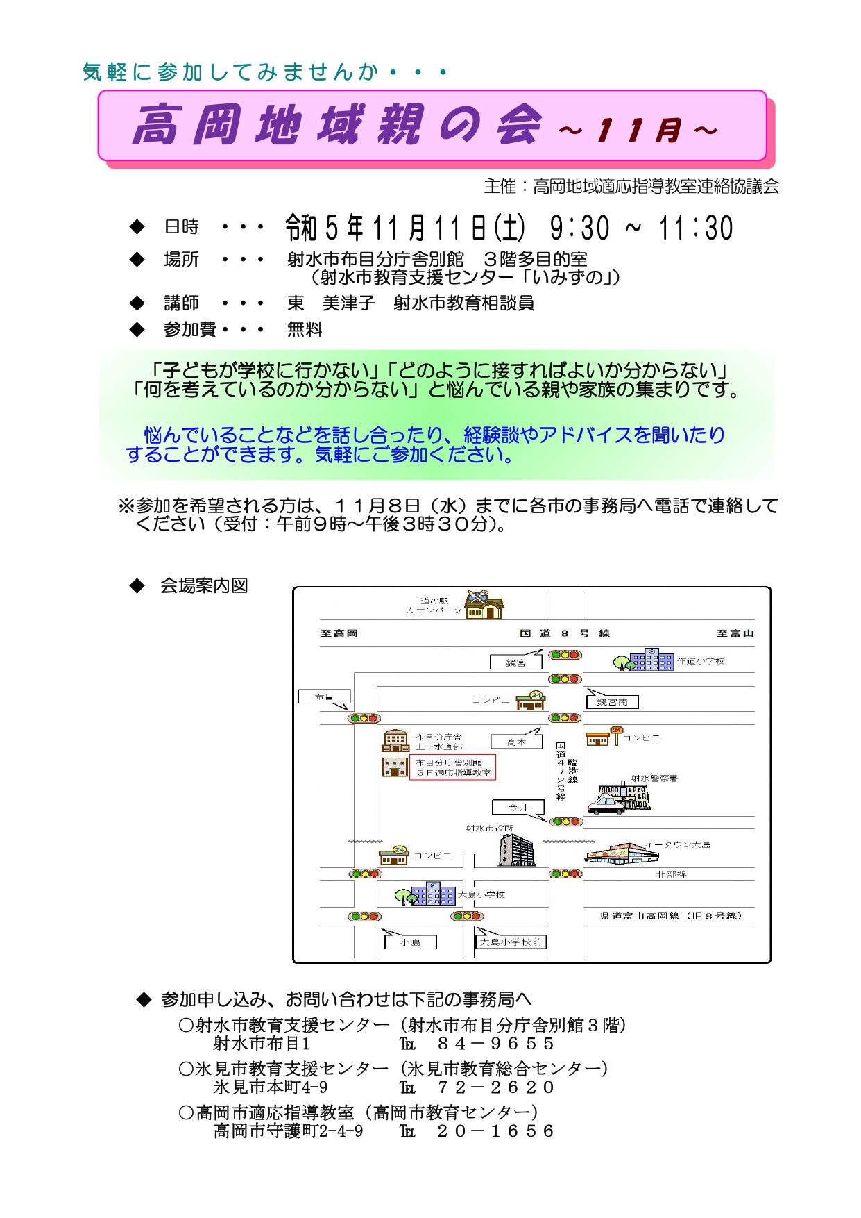 高岡市教育センターより、高岡地域親の会の案内が届きました。