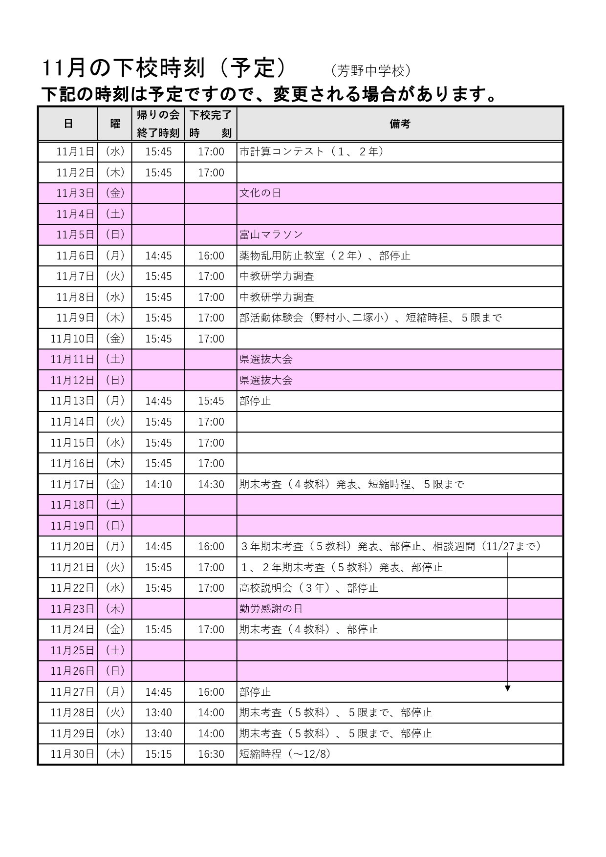 11月の下校予定時刻をお知らせします。ご確認ください。