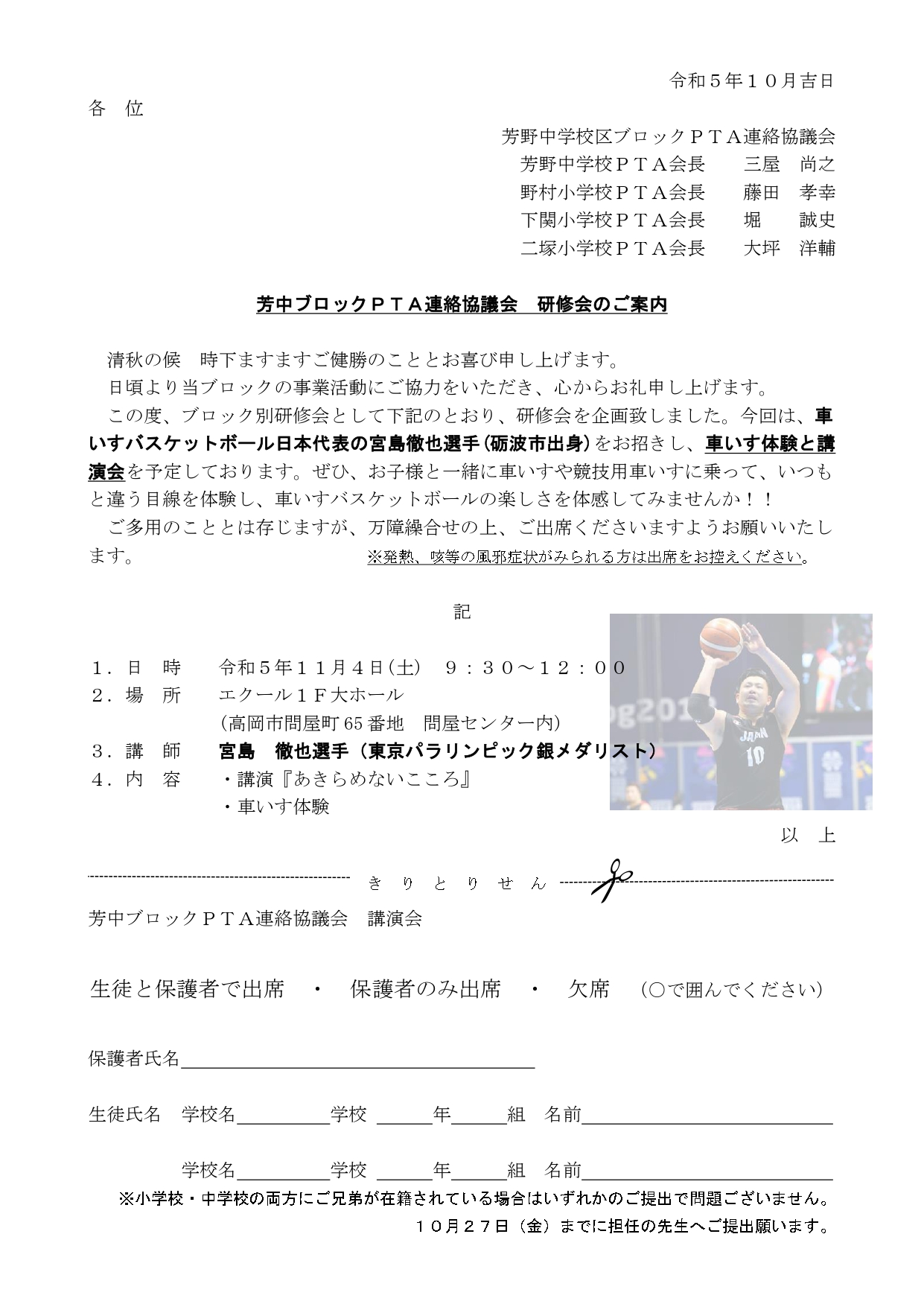 11月4日(土)に、車椅子バスケットボール日本代表の宮島徹選手(東京パラリンピック銀メダリスト)を講師に招き、PTAブロック研修会が開催されます。